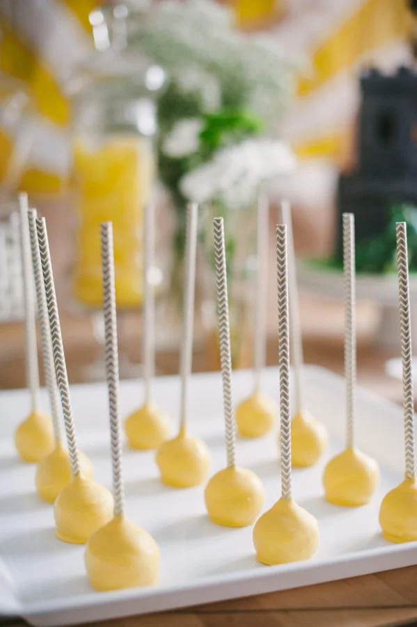 You can also search for different cake pop sticks for a fun way to display your treats. These cake pops are unique thanks to the use of bright yellow frosting and gray chevron sticks.
